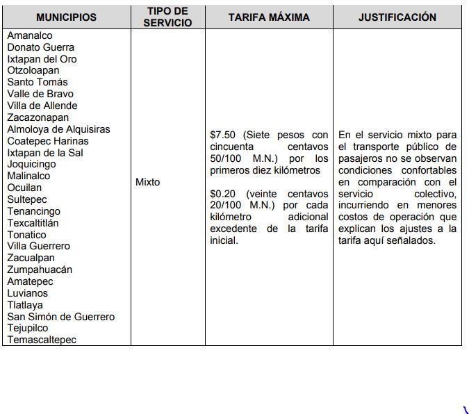 El día de hoy en la Gaceta del Gobierno del Estado de México se publico el “ACUERDO DEL SECRETARIO DE MOVILIDAD POR EL QUE SE MODIFICAN LAS TARIFAS MÁXIMAS PARA LA PRESTACIÓN DEL SERVICIO PÚBLICO DE TRANSPORTE, EN LA MODALIDAD DE COLECTIVO Y MIXTO”, mismo en el que se modifican las tarifas máximas de transporte público en las modalidades de colectivo y mixto conforme a la circunscripción territorial en materia de transporte público dentro de los municipios del Estado de México.